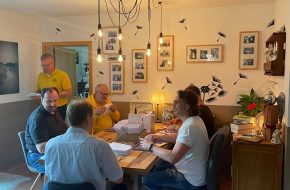So trafen sich am letzen Freitag der Gildevorstand beim amtierenden Schützenkönig Frank Wiesemann und tüteten unter Aufsicht des Kommandeurs Thomas Wiesemann sage und schreibe über eintausend Briefe ein.