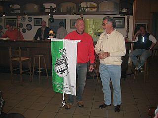 Die Freundschaft wurde vom 1. Brudermeister Hubert Müller der sich für die Einladung bedankte mit der Übergabe einer Fahne an unseren Hauptmann Willi Feltes für die Kompanie zum Ausdruck gebracht mit den Worten: Damit es nie wieder vorkomme, das ein "Fahnenklau" stattfinde.