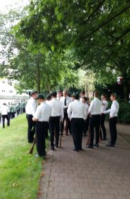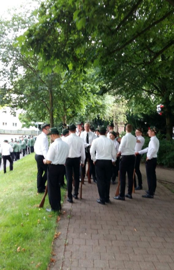 Schützen ohne Schützenrock tragen Dienstgradabzeichen und Stadtwappen auf dem weißen Oberhemd. Schützenhut mit Feder, grüne Schützenkrawatte, schwarze Hose, schwarze Socken, schwarze Schuhe,