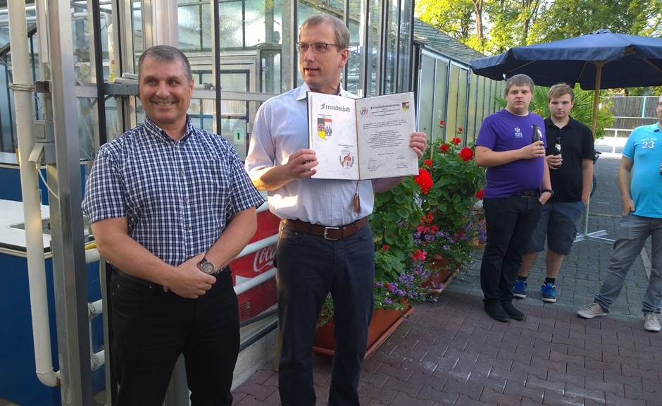 Werner Zühlke und Frank Zimmermann begrüßten die Anwesenden und präsentierten die Freundschaftsurkunde. Anschließen dankte Frank den beiden Initiatoren dieser Verbindung, Manfred Jouliet und Werner Zühlke, mit einem kleinen Geschenk.