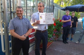 Werner Zühlke und Frank Zimmermann begrüßten die Anwesenden und präsentierten die Freundschaftsurkunde. Anschließen dankte Frank den beiden Initiatoren dieser Verbindung, Manfred Jouliet und Werner Zühlke, mit einem kleinen Geschenk.