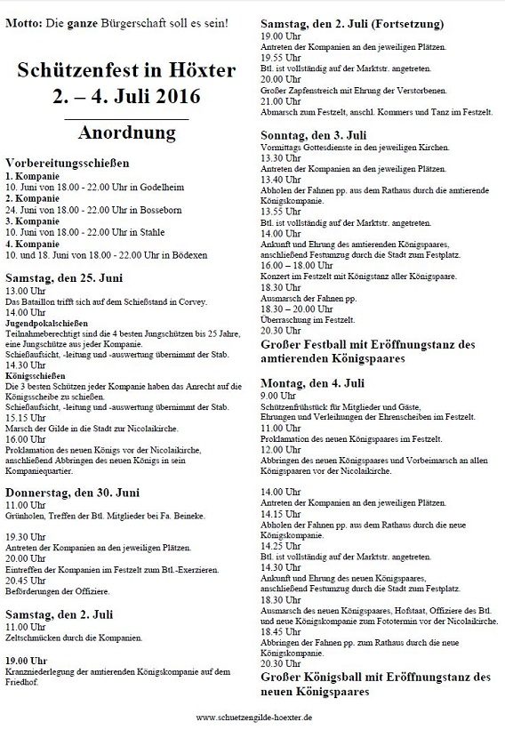 Es gibt nur ein Vorbereitungsschießen der Ersten Kompanie in Godelheim. Wir treffen uns am 10.06.2016. An dem Abend wird auch die Ehrenscheibe ausgeschossen.