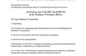 am Freitag den 31. März 2017 findet um 20.00 Uhr im Paulaner Wirthaus Höxter unsere erste Kompanieversammlung des Jahres statt.