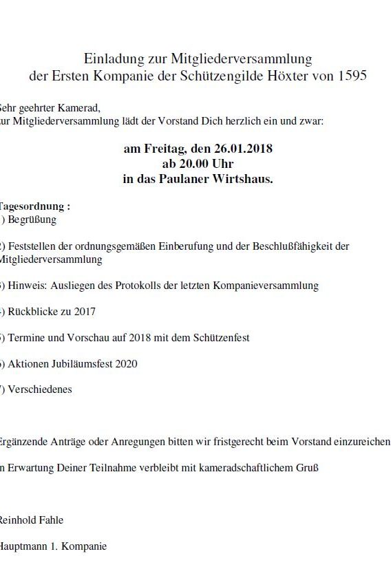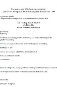 am Freitag den 26.01.2018 findet die Erste Kompanieversammlung des Jahres statt. Gestartet wird um 20.00 Uhr im Paulaner Wirtshaus Höxter.
