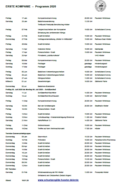 Im kommenden Jahr 2020 steht nicht nur unser Jubiläumsfest als das Ereignis auf dem Jahresplan. So sind übers Jahr in fast jedem Monat immer wieder Veranstaltungen, die sich mit dem Schützenwesen und der Schützengilde Höxter beschäftigen.