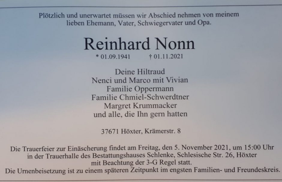 Am 01. November 2021 verstarb unser Offizierskamerad Reinhard Nonn plötzlich und unerwartet.