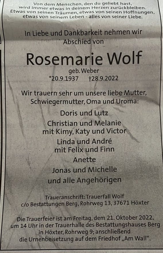 am 28.09.2022 verstarb unsere Kronprinzessin Rosemarie Wolf.