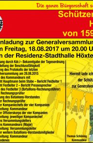 Kommandeur Thomas Schöning lädt alle Mitglieder zur diesjährigen Generalversammlung am 18. August 2017 in die Stadthalle Höxter recht herzlich ein und hofft auf eine rege Beteiligung.