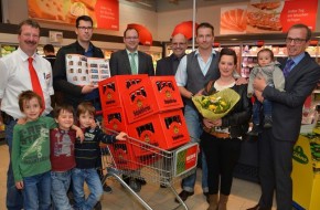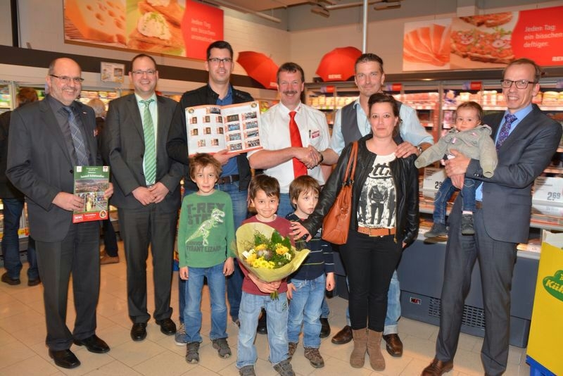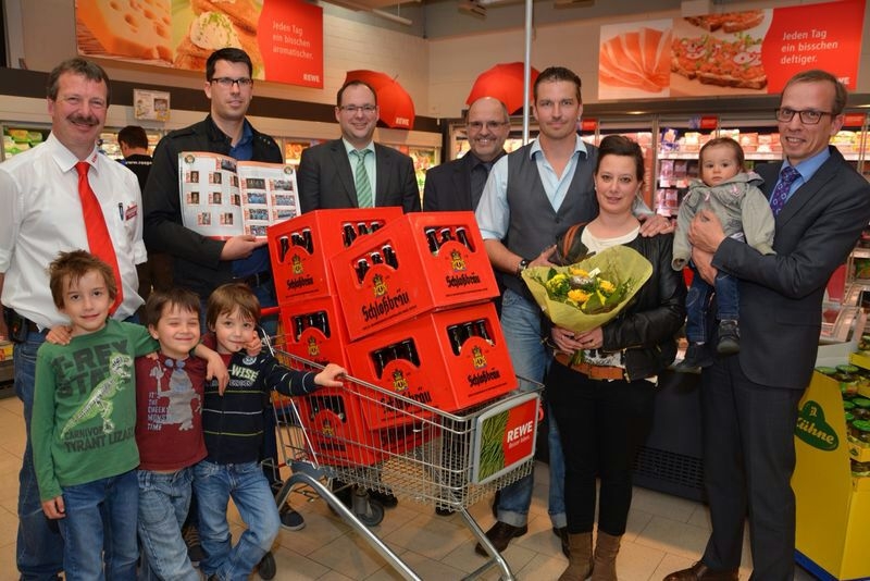 So nahmen die Familie Schrader und Martin Röske im Beisein unseres Bürgermeisters Alexander Fischer und der Rewe-Bereichsleitung stellvertretend die bei der Vorstellung des Heftes ausgelobten 5 Kisten Bier entgegen.