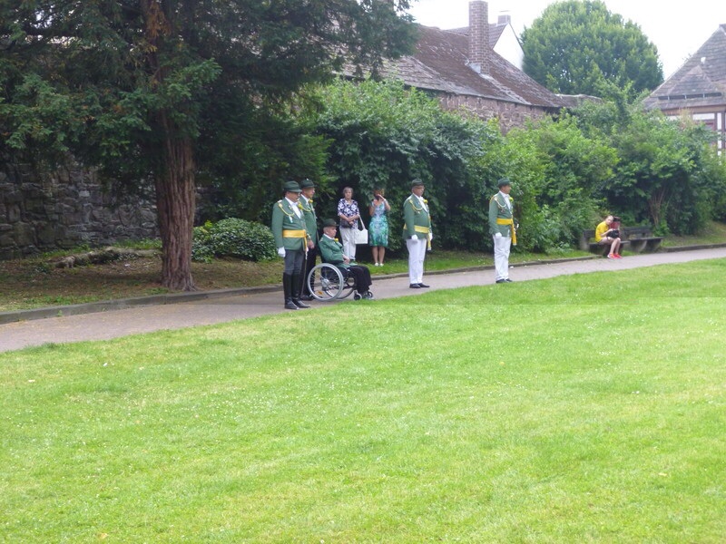 Es war sein großer Wunsch, "dabei" zu sein; er hatte mit irgendwo am Straßenrand stehend gerechnet - aber dass ihm sogar eine aktive Teilnahme ermöglicht wurde, das hätte er (und wir ganz ehrlich auch) niemals erwartet. Und dann noch die Beförderung! Ich weiß nicht, ob Sie es gesehen haben, aber er hatte mehrfach Tränen der Rührung in den Augen. Als ich ihn vorhin nach Hause ins Konrad-Beckhaus-Heim brachte, saß er in seinem Zimmer, schüttelte immer wieder ungläubig den Kopf und sagte "Das gibt es doch gar nicht, das kann alles nicht wahr sein!" Seine Schützenjacke durfte ich auch nicht zum Auslüften ins Bad hängen, die musste sichtbar im Zimmer bleiben, damit er sie weiterhin anschauen konnte. Sie alle haben zu einem für ihn unvergesslichen Tag beigetragen. Es war schön zu sehen, welche Kameradschaft es gibt. Und ich weiß aus eigener Erfahrung, welche Schwerstarbeit die Kameraden beim Rollstuhlschieben, vor allem auch bei diesem Wetter, geleistet haben!