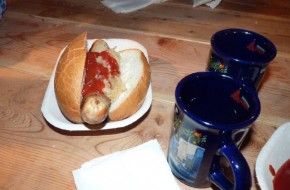 Neben Bratwurst und anderen Leckereien werden auch warme und kühle Getränke gereicht, für gute Stimmung und einen trockenen Unterstand wird