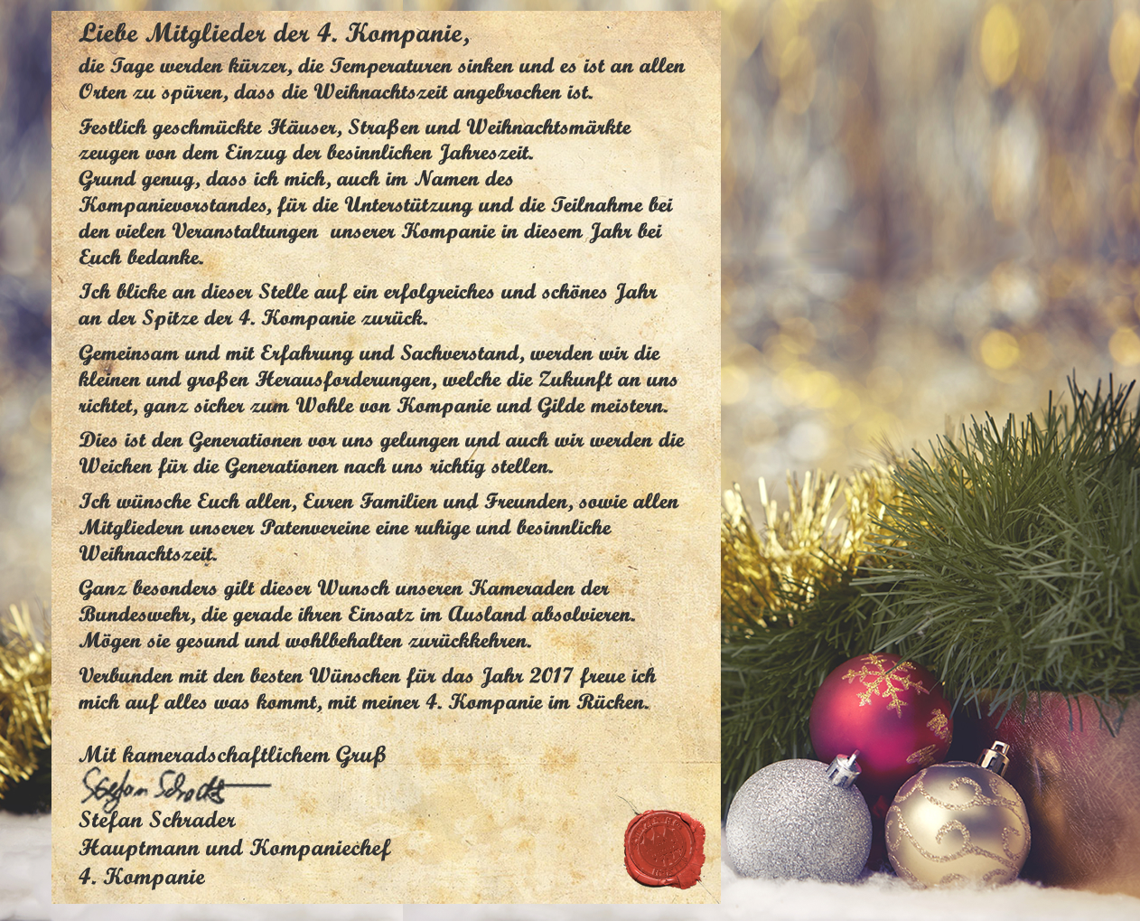Das Jahr 2016 neigt sich mit großen Schritten dem Ende entgegen und der Vorstand um den Hauptmann Stefan Schrader möchte sich für das entgegengebrachte Vertrauen in diesem Jahr bedanken!