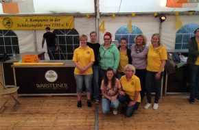 Zig Tische und Stühle wurden in dem zugewiesenen Bereich aufgestellt, gelbe Accessoires, die von den Frauen in vielen gemeinsamen Abenden erstellt wurden, schmücken nun den Bereich der Vierten. Indirekte Beleuchtung und Kompaniefahnen werden einen bleibenden Eindruck auf die Gäste des Schützenfestes hinterlassen.