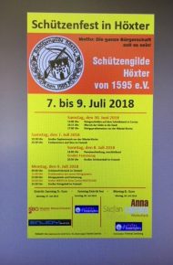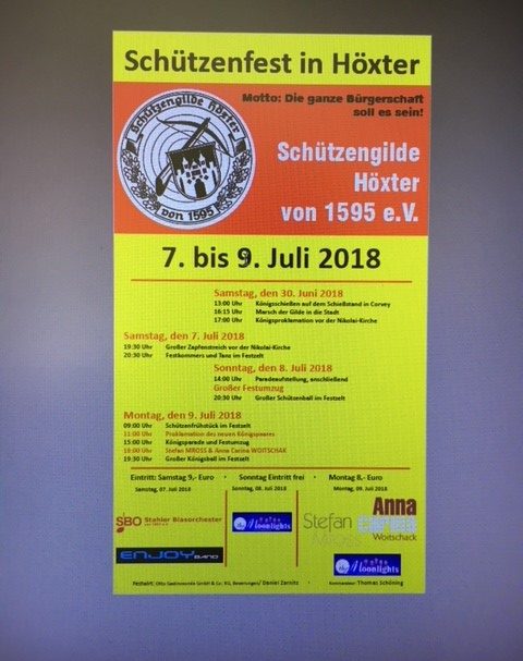 So darf man sich in Höxter auf ein Schützenfest mit einem hoffentlich spannenden Königsschießen am 30.06.2018, einem Großen Zapfenstreich am Samstag, einem großen Festumzug am Schützenfestsonntag und einer Proklamation des neuen Schützkönigspaares mit anschließendem TopAct wie z. B. Stefan Mross und Anna Carina Woitschak freuen, ohne an den Terminkalender der Weltmeisterschaft zu denken.