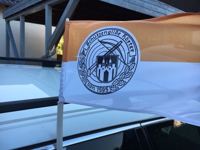 Ab dem zweiten Vorbereitungsschießen sind daher neben den bekannten Fahnen, Poloshirts und Krawattennadeln nun auch Autofahnen bei unserem Rechnungsführer zu erwerben.