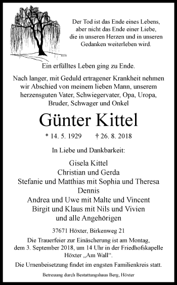 Die Trauerfeier findet am kommenden Montag um 14:00 Uhr in der Friedhofskapelle "Am Wall" statt.
