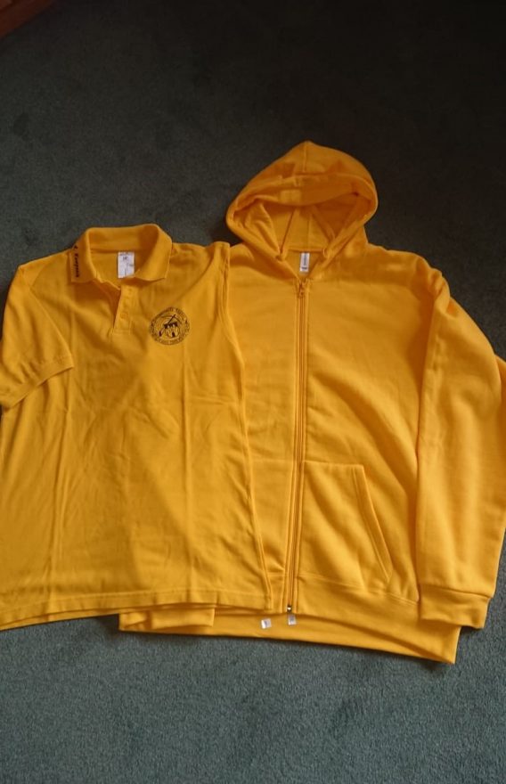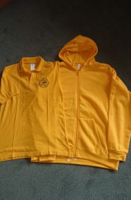 Die Sweatshirtjacke ist gelb, mit Kompanielogo und ist zu einem Betrag von 30,-€  in den Größen L bis 4XL zu bekommen.