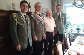 Kommandeur der Schützengilde Höxter Thomas Wiesemann, der damalige Hauptmann Franz Meier-Tegetmeier, der aktuelle König Frank Wiesemann und sein Hauptmann Stefan Schrader besuchten den Jubilar und gratulierten ihm im Namen der ganzen