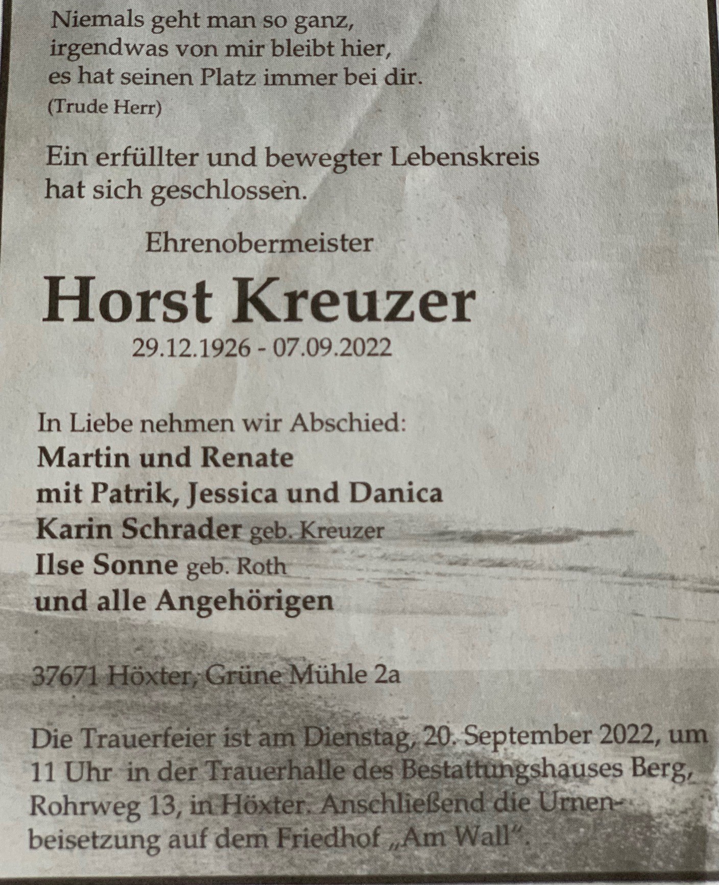 Am 07. September 2022 verstarb mit Horst Kreuzer das älteste Mitglied der Vierte Kompanie und der Schützengilde Höxter.