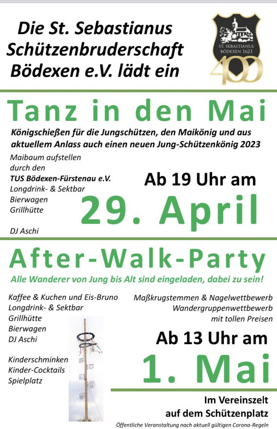 Die St. Sebastianus Schützenbruderschaft Bödexen e. V. lädt auch in diesem Jahr die Schützenbrüder der Vierten Kompanie zum Maibaumsetzen am