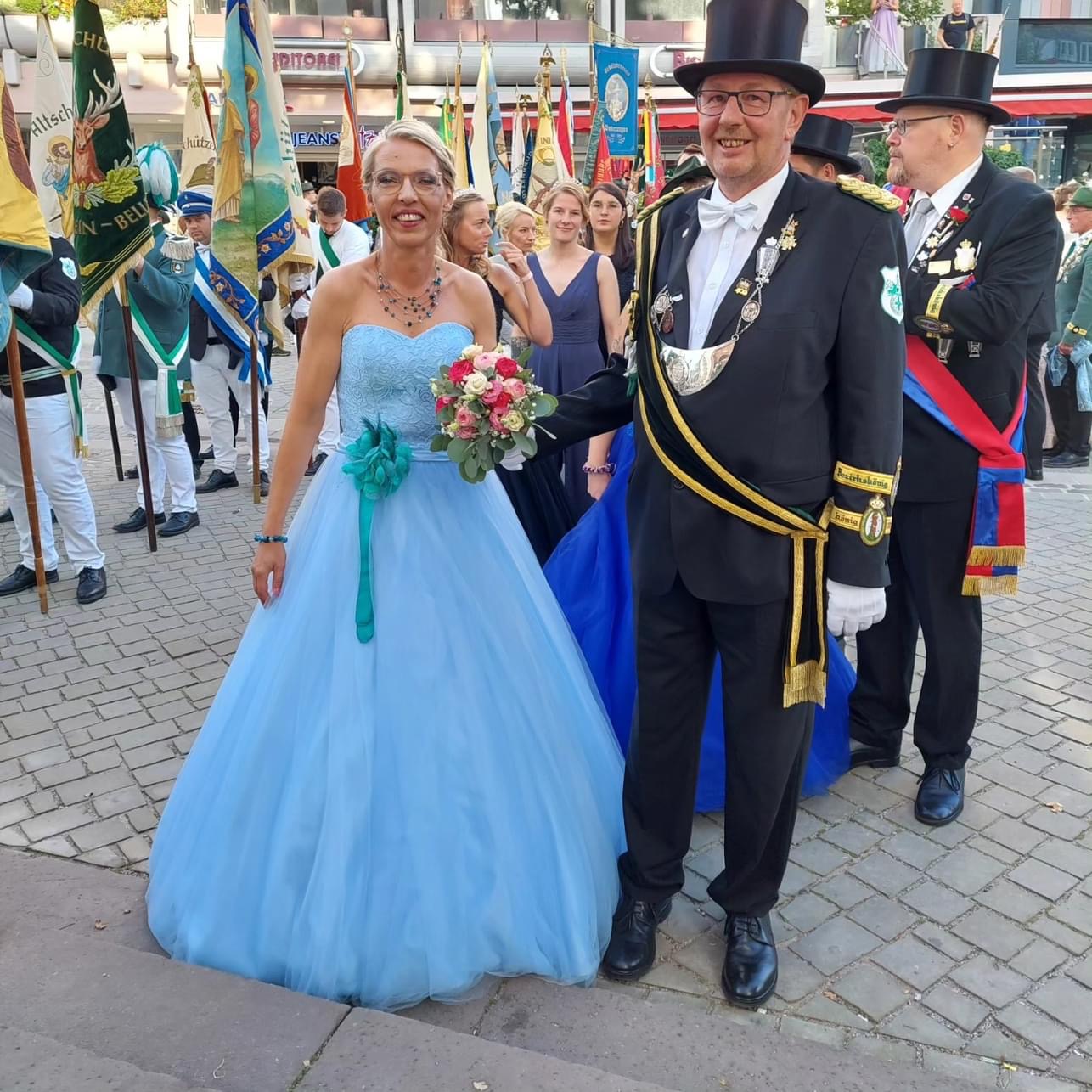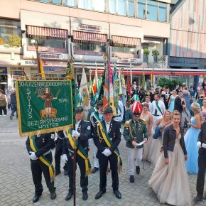 Es war ein imposantes und farbenprächtiges Bild, das sich ergab, als sich die Königspaare samt Hofstaaten und Schützen gemeinsam mit drei Musikkapellen die Marktstraße hinauf in Richtung Stadthalle im Festumzug auf den Weg machten. Dazu wurde auch das Landesgartenschaugelände in der Wallstraße überquert, weil Bürgermeister Daniel Hartmann im Umzug ganz vorne mit dabei war und den Schlüssel für das Tor in der Tasche hatte. Bewegt von dem prächtigen Anblick war neben Bürgermeister Daniel Hartmann und der Bezirksbundesmeister Stefan Rüther, der zusammen mit dem Bürgermeister in der aus „allen Nähten platzenden“ Stadthalle ein paar kurze Grußworte an die Gäste richtete. Bevor der Ball der Könige jedoch offiziell mit dem Königstanz startete, begrüßte Brudermeister Stefan Berens sämtliche geladenen Gäste, Obristen und Majestäten einzeln mit Namen. Nach dem Abendessen eröffneten dann die Bezirkskönige Wolfgang Schröder von der St. Sebastianus Schützenbruderschaft Bödexen und Markus Scholz von St. Kilian Lügde die Tanzfläche und somit auch den Königsball gemeinsam mit ihren Königinnen zum Lied „Moviestar“. Musikalisch unterhielt die Band „Unglaublich“ die Gäste an diesem Abend.