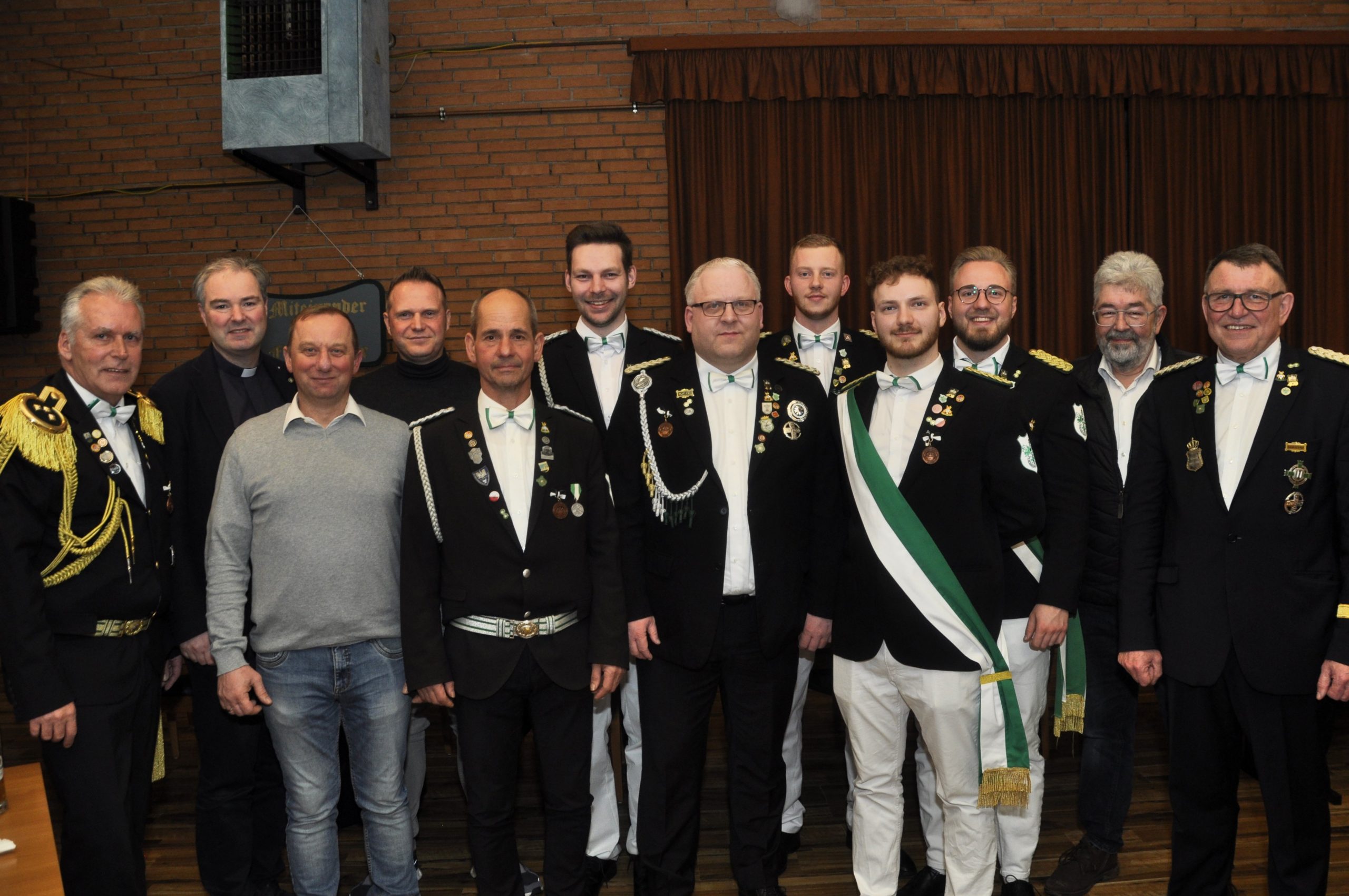 Von links nach rechts: Oberst Thomas Buch; Präses Tobias Spittmann; Bernd Metz, neuer Schriftführer; Magnus Grothe, neuer Damenoffizier Altschützen; Axel Erben, bisheriger Damenoffizier Altschützen; Marvin Nowinski, neuer Damenoffizier Jungschützen; Matthias Schoppe, bisheriger Schriftführer; Robin Plettner, neuer Spieß Jungschützen; Christopher Grothe, bisheriger Damenoffizier Jungschützen; Marten Altmiks, bisheriger Spieß Jungschützen; Christoph Schröder, neuer Brudermeister und Stefan Berens, bisheriger Brudermeister