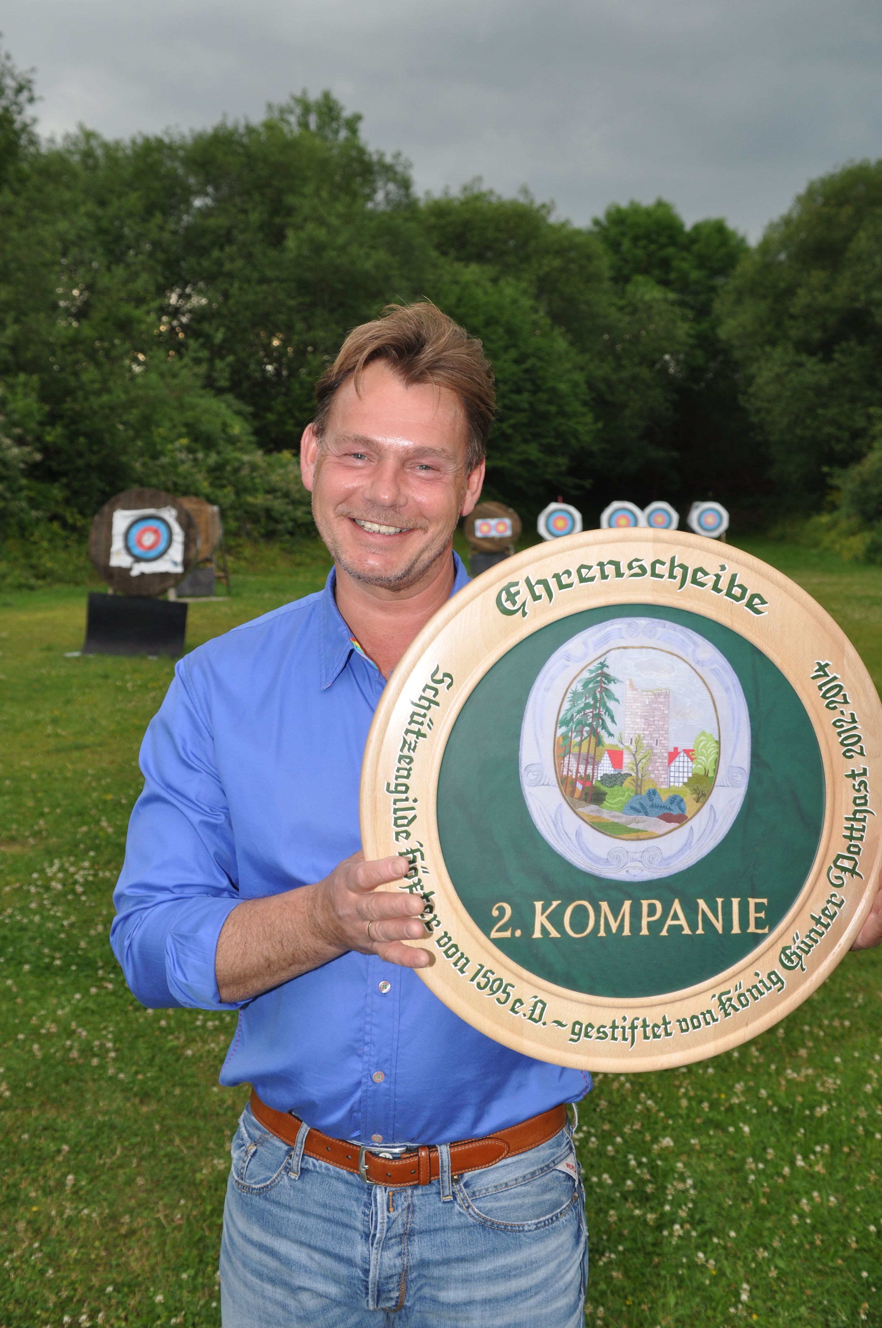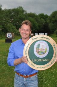 Noch hält Hauptmann Alfred Micus die von Schützenkönig Günter Potthast gestiftete Ehrenscheibe in Händen. Wohl wissend, dass er sie am Schützenfest-Montag dem besten Schützen der 2. Kompanie überreichen darf. Voraussetzung: Man hatte am 27. Juni in Corvey eine ruhige Hand und etwas Glück.