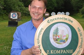 Noch hält Hauptmann Alfred Micus die von Schützenkönig Günter Potthast gestiftete Ehrenscheibe in Händen. Wohl wissend, dass er sie am Schützenfest-Montag dem besten Schützen der 2. Kompanie überreichen darf. Voraussetzung: Man hatte am 27. Juni in Corvey eine ruhige Hand und etwas Glück.