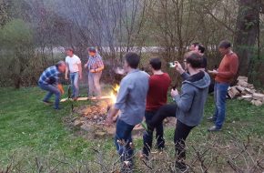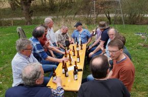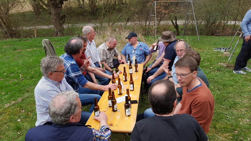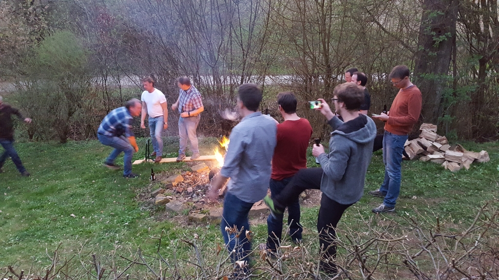 Zur Offizierswanderung hatten Sven Kröning, Thomas Hüttig, Florian Vieth und Sascha Kamp geladen, um damit den zweiten Teil ihrer ‚Offiziers-Beförderungs-Verpflichtung‘ einzulösen. Wie hatte es in der Einladung doch gelautet: „Selbstverständlich gilt es, angekommen an unserem Ziel, das leibliche Wohl zu befriedigen. Hier werden wir für Euch, nach der altbewährten Art unserer Vorfahren, bestes Fleisch direkt über der heißen Glut zubereiten. Derweil reichen wir ein süffiges, traditionelles Kaltgetränk aus Hopfen, Malz, Hefe und Wasser.“ Unter diesen vielversprechenden Voraussetzungen verbrachte man etliche Stunden bei guter Laune am Lagerfeuer.