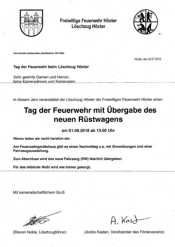 Tag der Feuerwehr mit Übergabe des neuen Rüstwagens am 01.09.2018 ab 13:00 Uhr