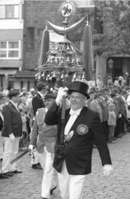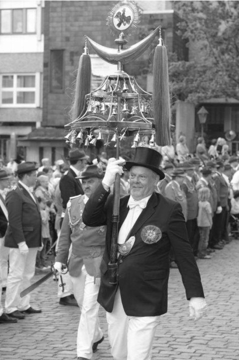 1998 hat Siegfried den Schellenbaum vom damaligen Schützenkönig Hans-Christian Kurze übernommen. Der Schellenbaum, einst ein Geschenk des Herzogs von Ratibor und Fürst von Corvey an die Schützengilde, wird seit 1848 bei den Umzügen getragen und ist eines der historischen Insignien unserer Gilde. 14 Jahre führte Siegfried stolz mit dem Schellenbaum die großen Festumzüge in Höxter an prägte damit nachhaltig das Bild unserer Schützenfeste. Auch die geselligen Stunden im Rathaus vor den Umzügen genoss er sehr, bevor er 2012 den Schellenbaum in neue, treue Hände gab.